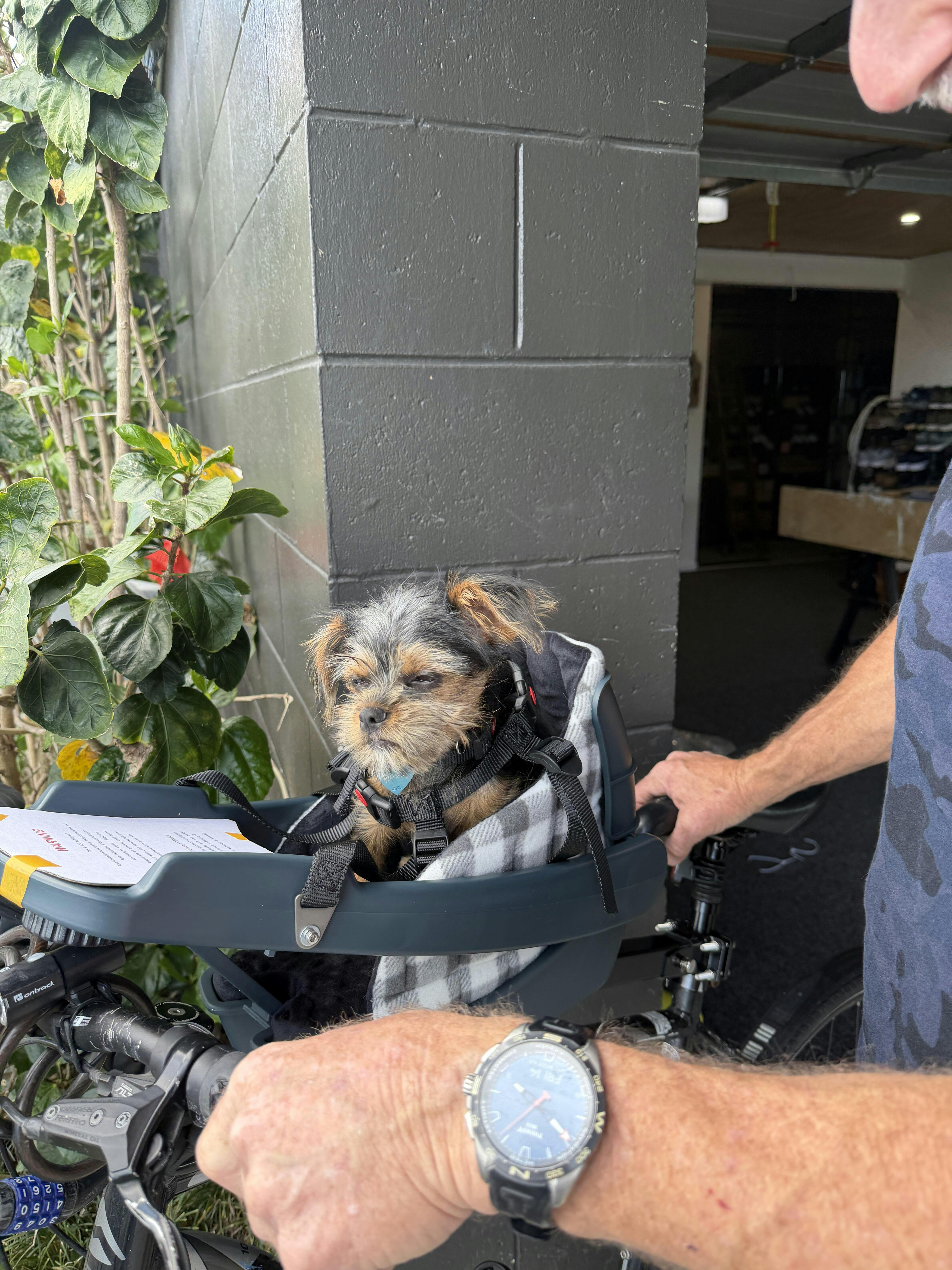 We have a very slim 3 kg puppy and the harness around the collar is way too big for him. I’ve had to sew up both sides to reduce the size and we are trying it today like that. It only fits on my partner’s bike as I have an E bike step over and it apparently won’t go on a step over.